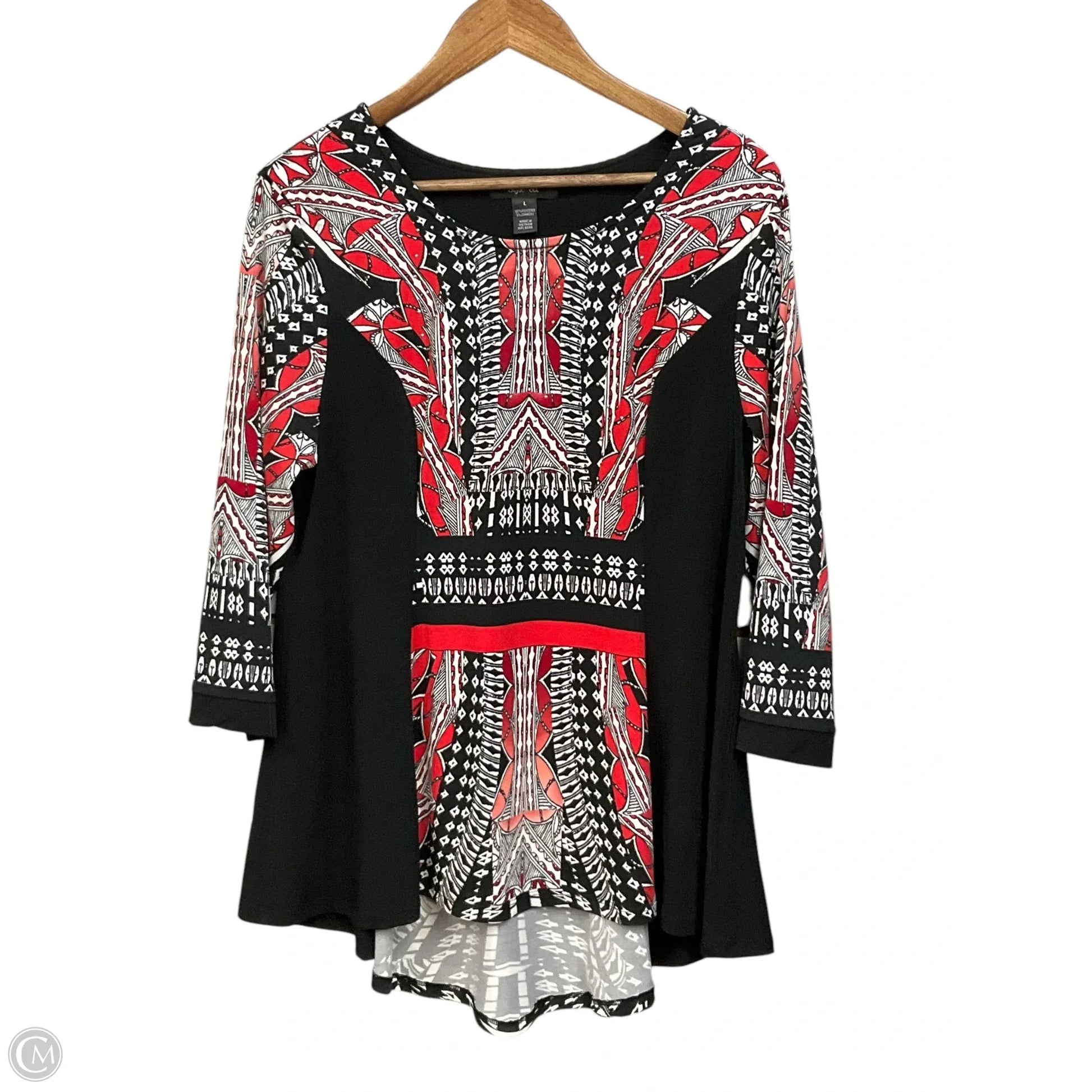 Unleash your vibrant side with the Style And Company 3/4 Sleeve Blouse in Black & Red, Size: L. Feel the soft fabric hug your curves while making a bold fashion statement. Embrace confidence in every stitch. Add to cart and conquer the day!