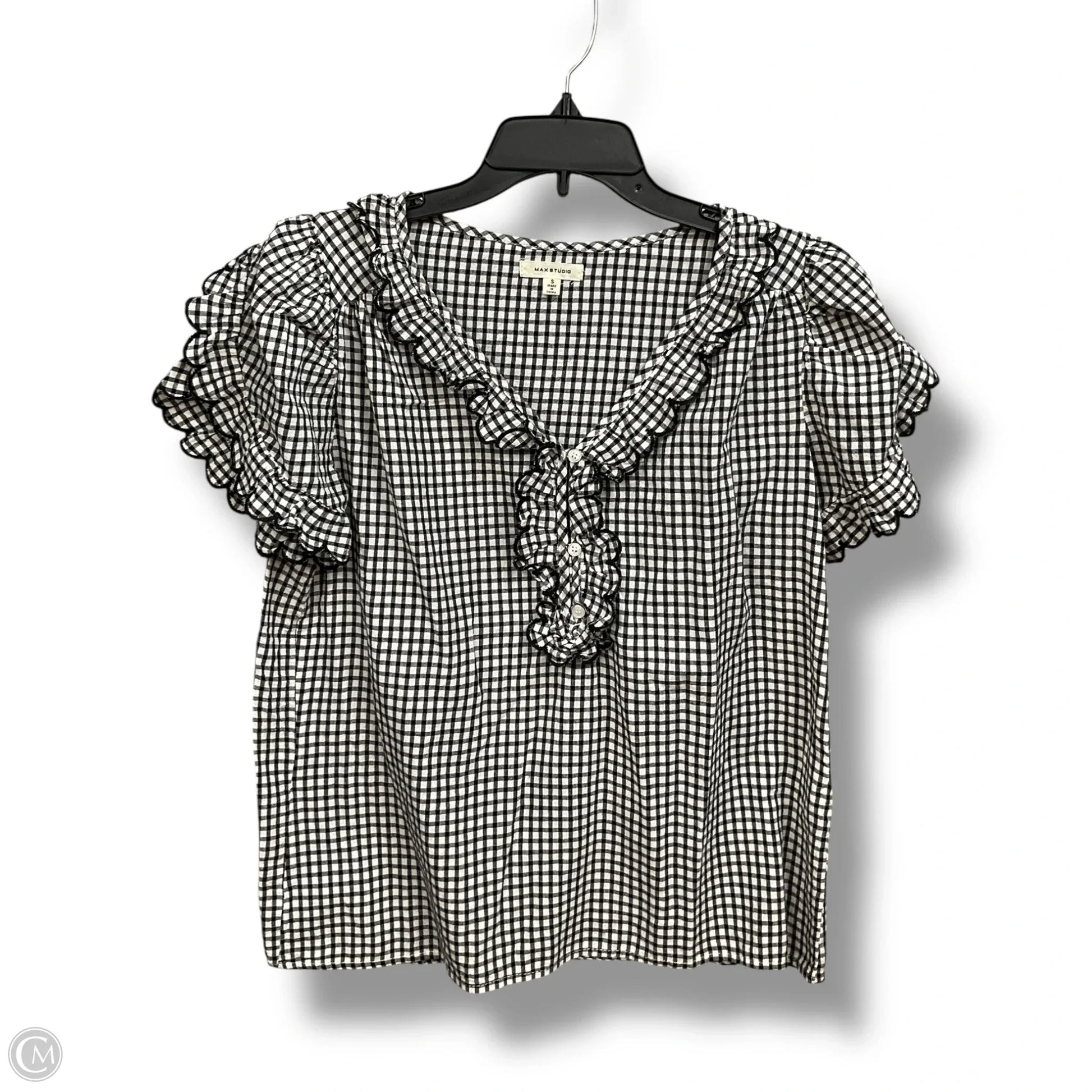 Max Studio short sleeve blouse in chic checkered pattern, size S, exudes sophistication.