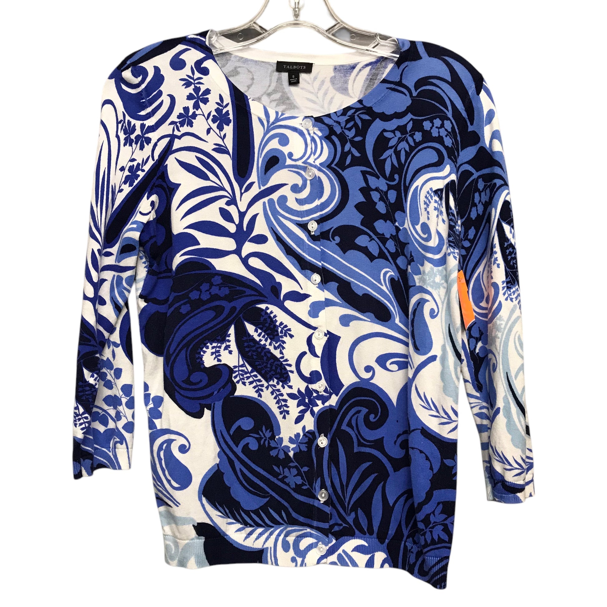 Step into timeless elegance with this Talbots blue and white cardigan in size S. Crafted with quality fabric, this classic piece exudes sophistication, enhancing your style effortlessly. Elevate your wardrobe today.