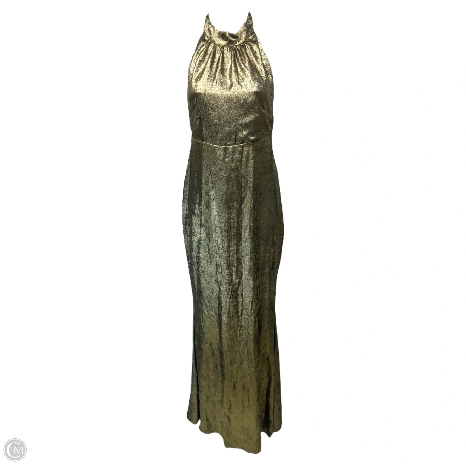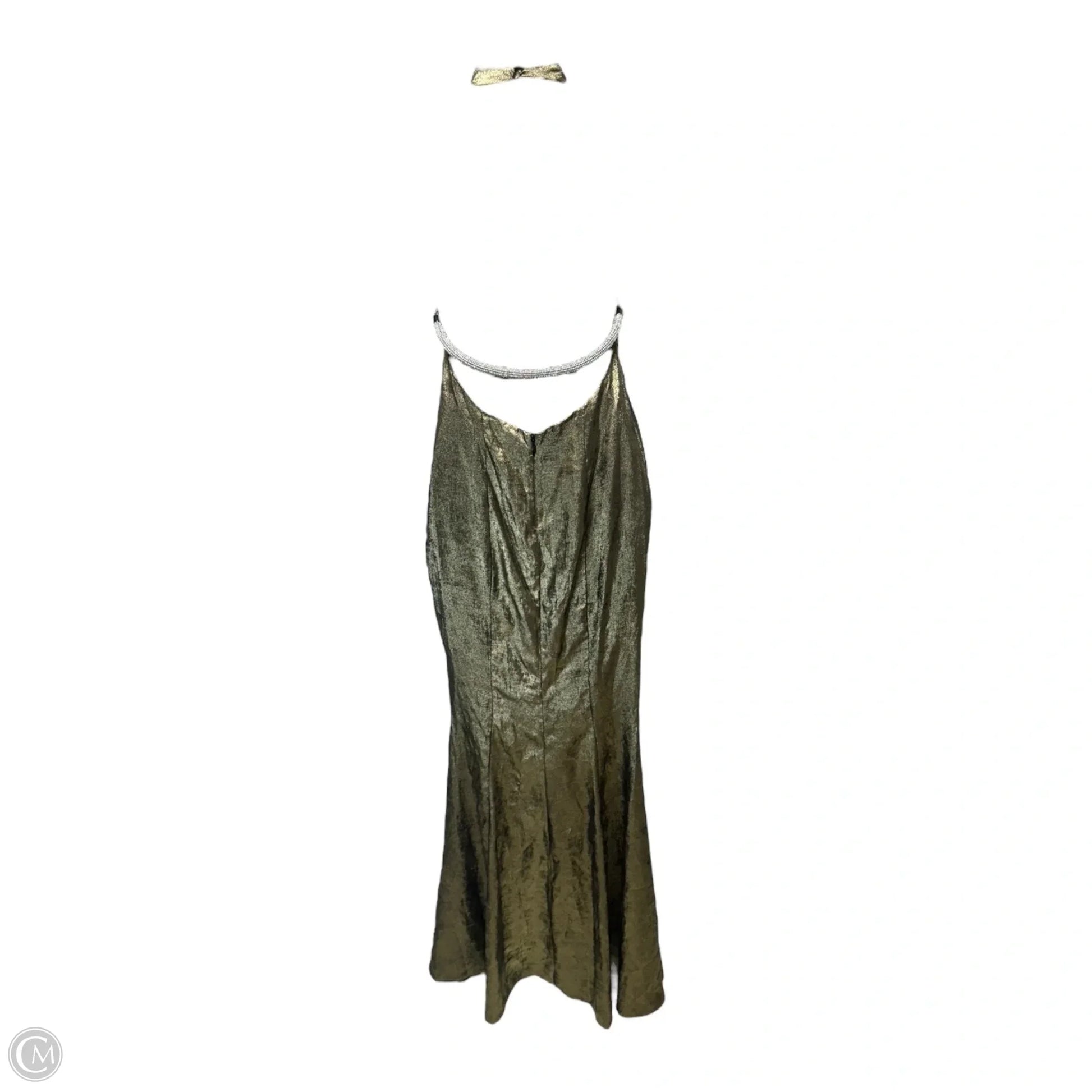 Metallic Halter Column Gown with Crystal Trim Back By Badgley Mischka In Gold Dark Gray, Size: 0