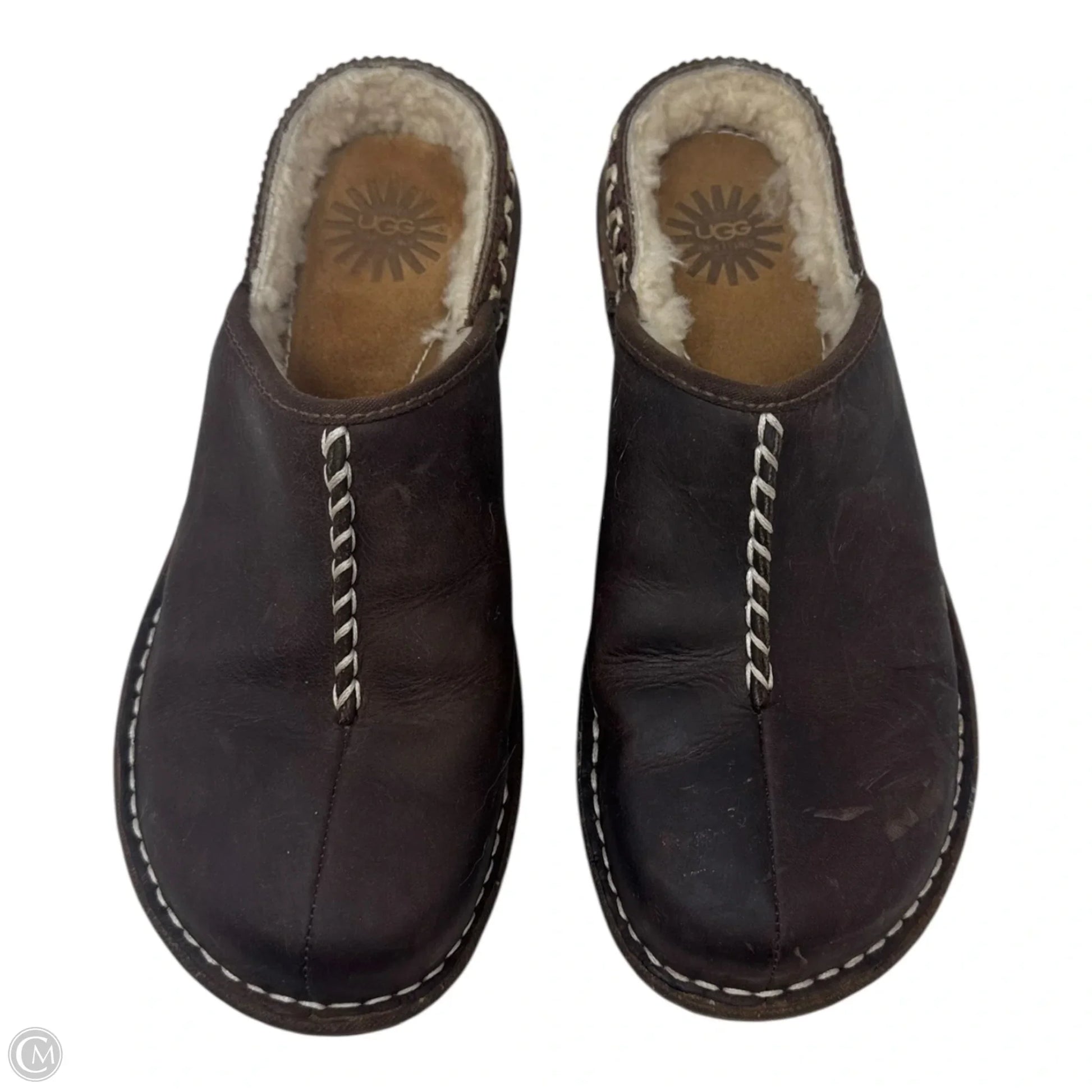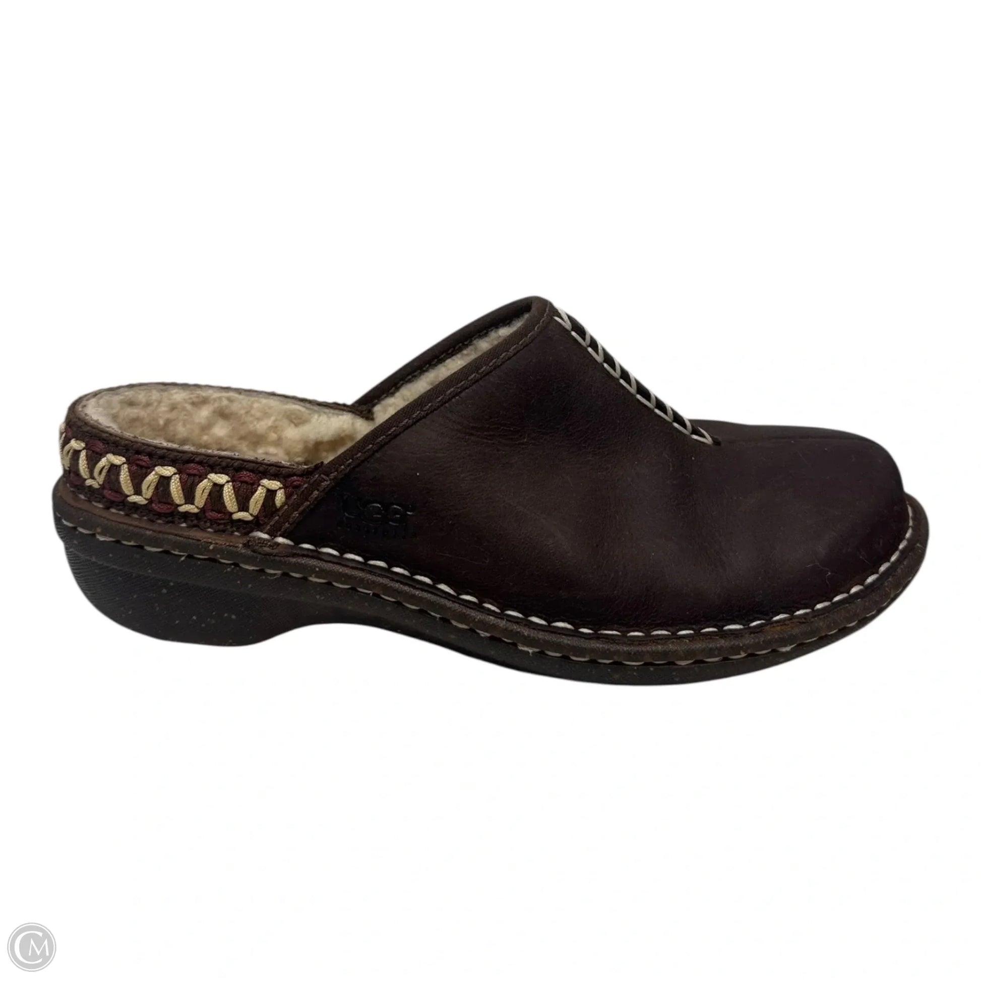 Fur Lined Leather Mules Shoes Designer By Ugg In Brown, Size: 8