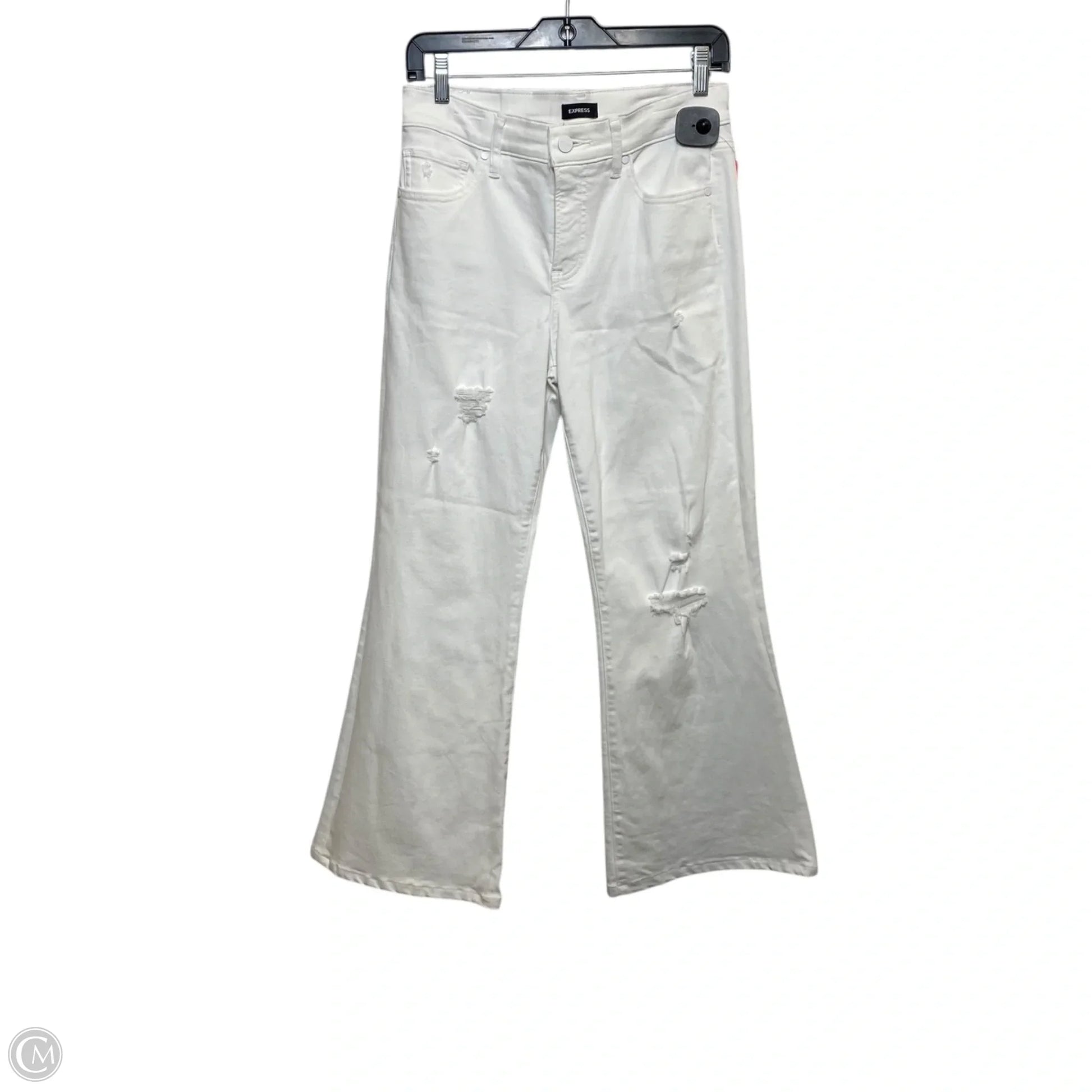 White denim flared jeans by Express in size 6, a crisp, chic staple for versatile outfits.