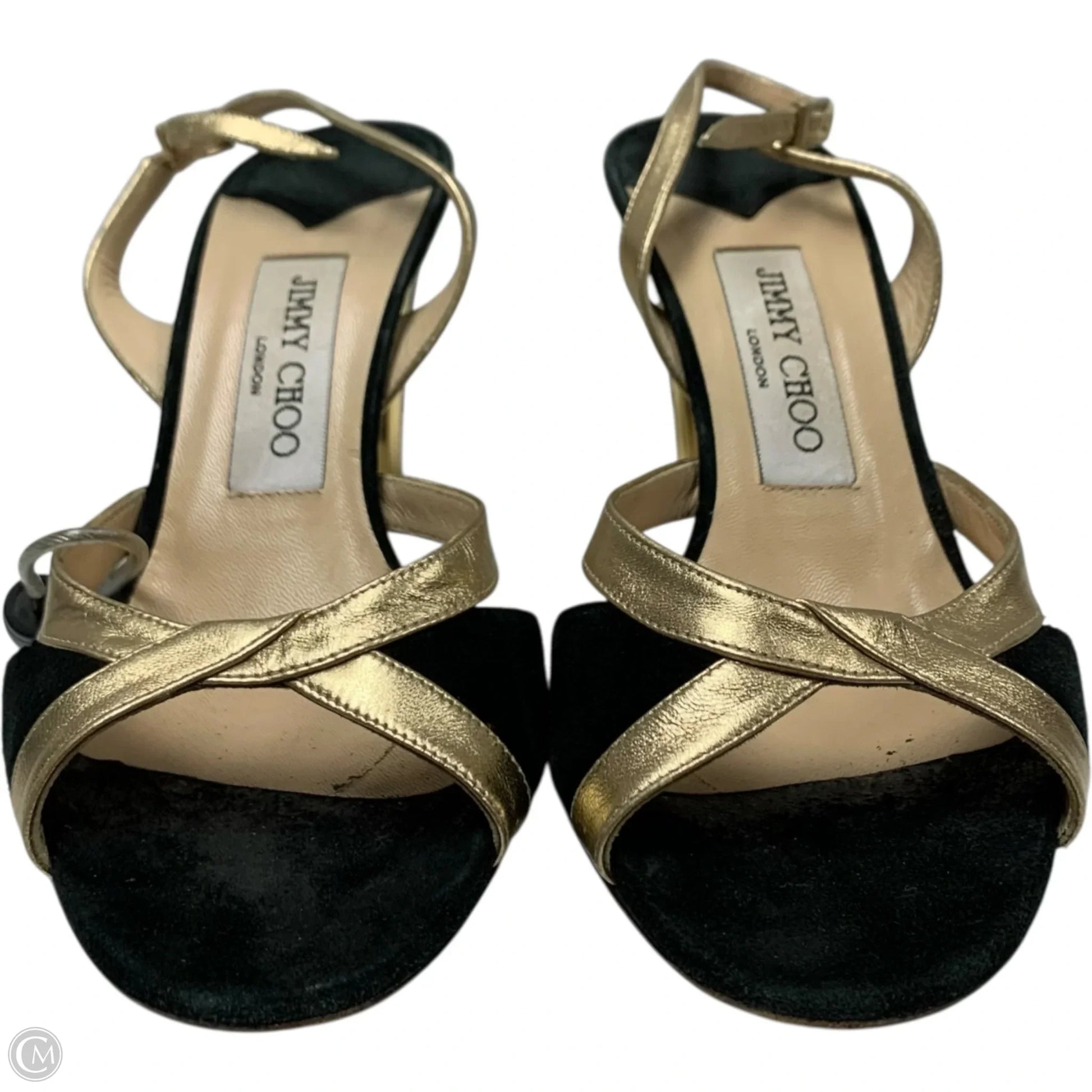 Sandals Luxury Designer By Jimmy Choo In Black & Gold, Size: 6.5