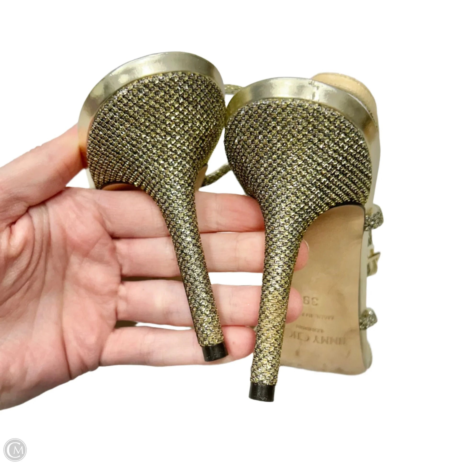 Sandals Luxury Designer By Jimmy Choo In Gold, Size: 9
