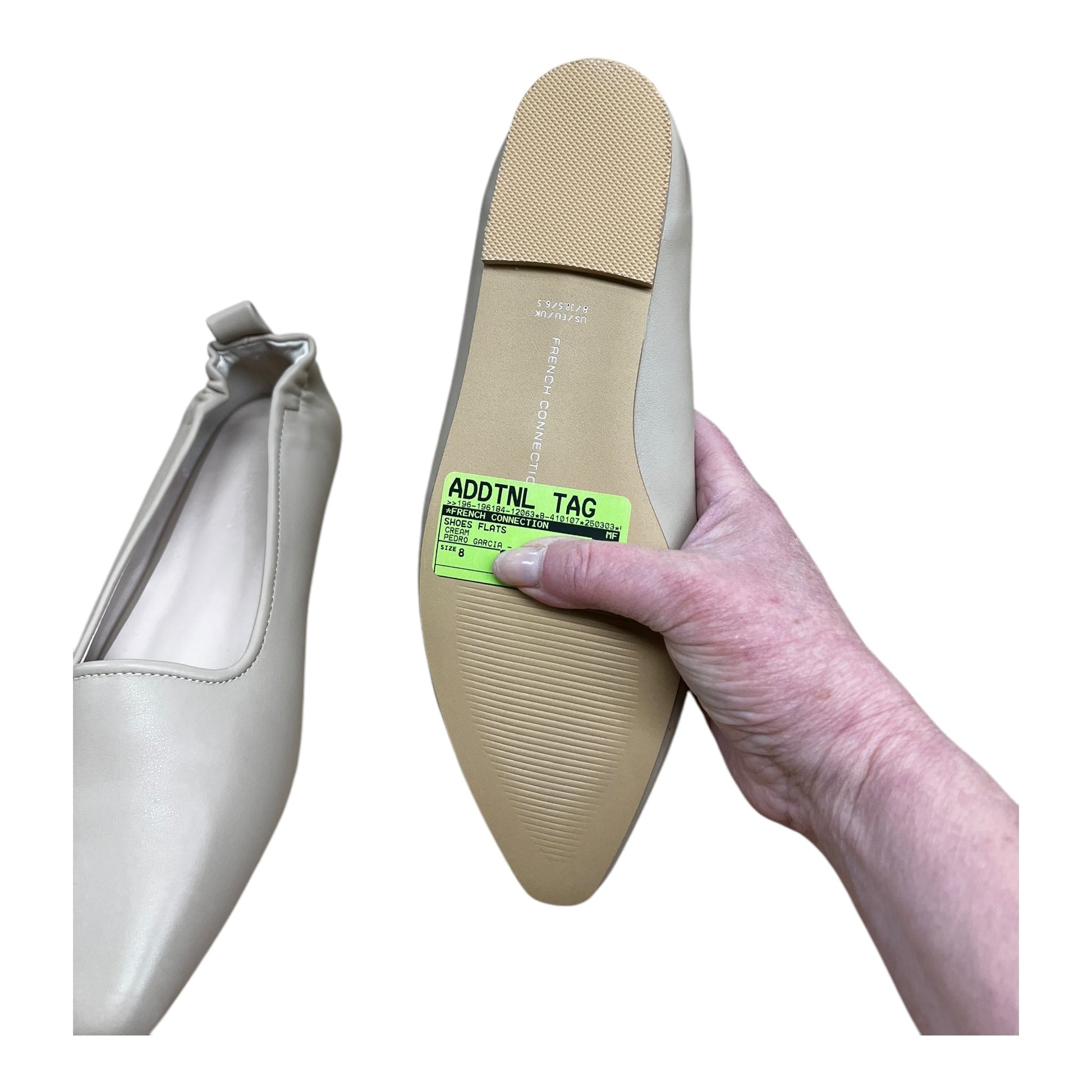 Step into sophistication with French Connection Cream Flats in Size 8. Chic design, comfort, and quality in every step. Experience elegance.