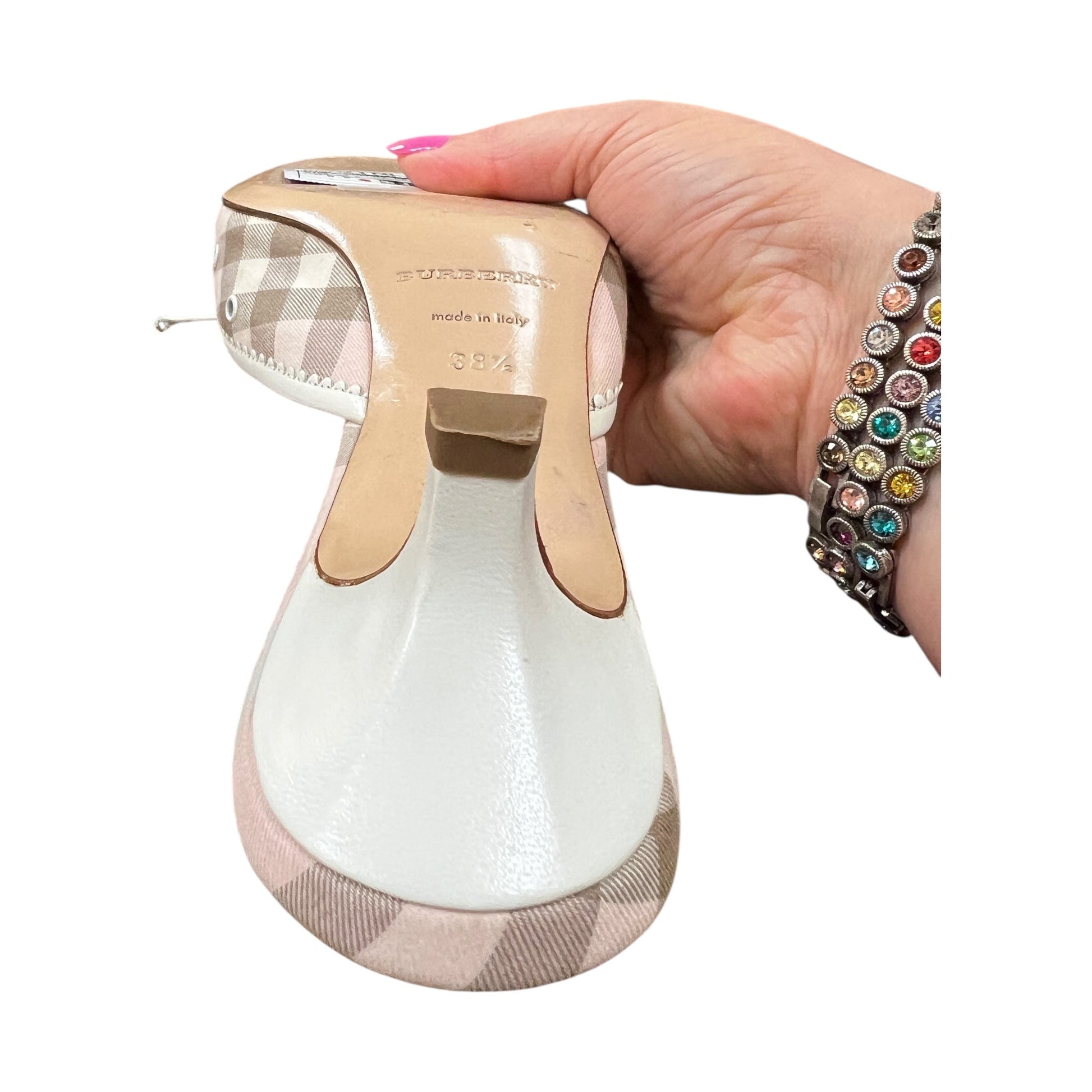 Step out in style with these luxurious pink Burberry designer shoes in size 8.5. Chic, sophisticated, and utterly fabulous.