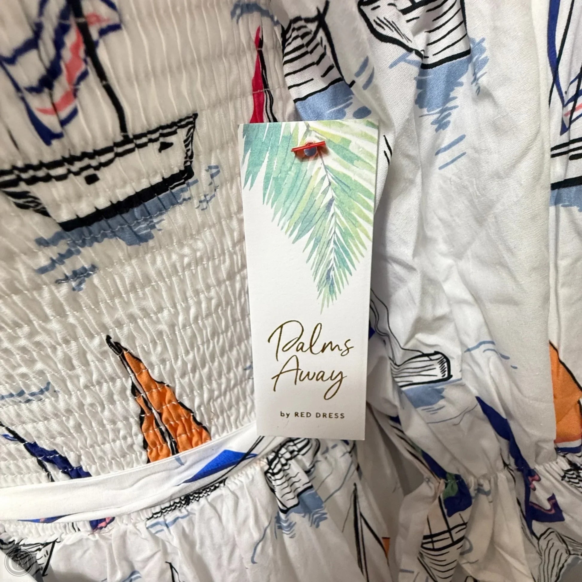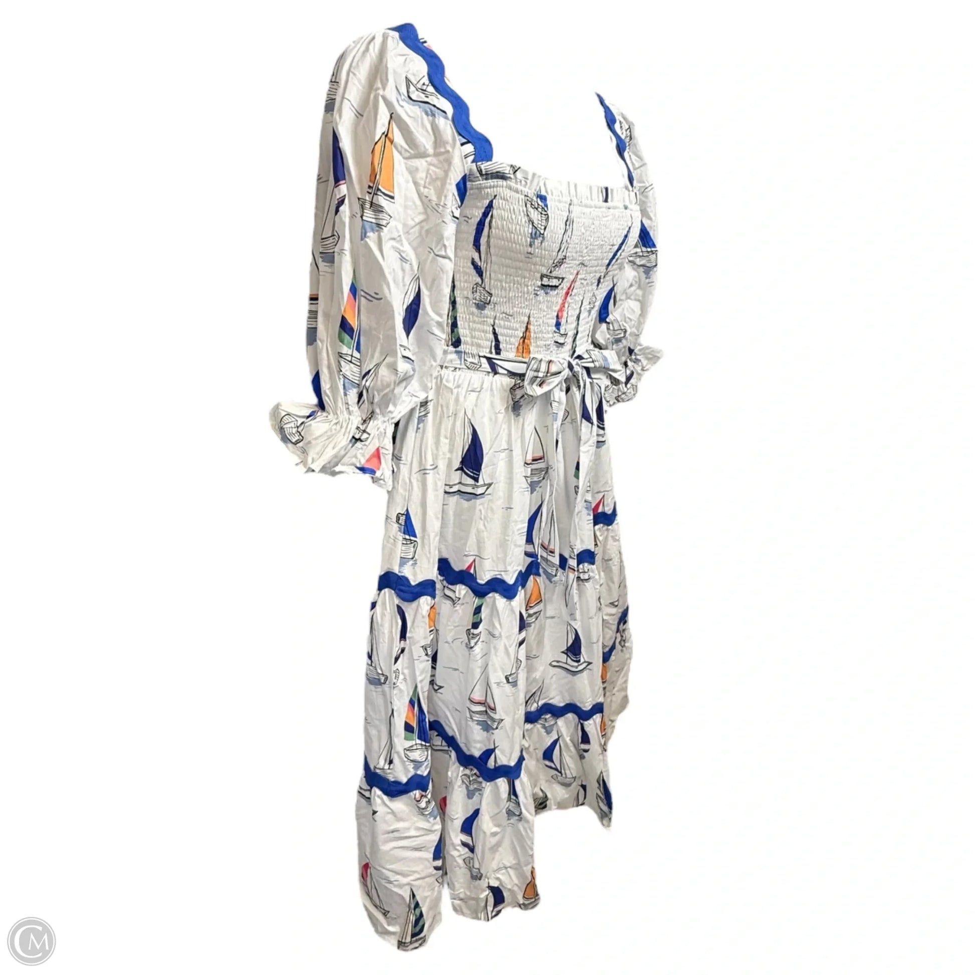 Vibrant nautical midi dress by Palms Away with smocked puff sleeves and belted waist, size Lp.