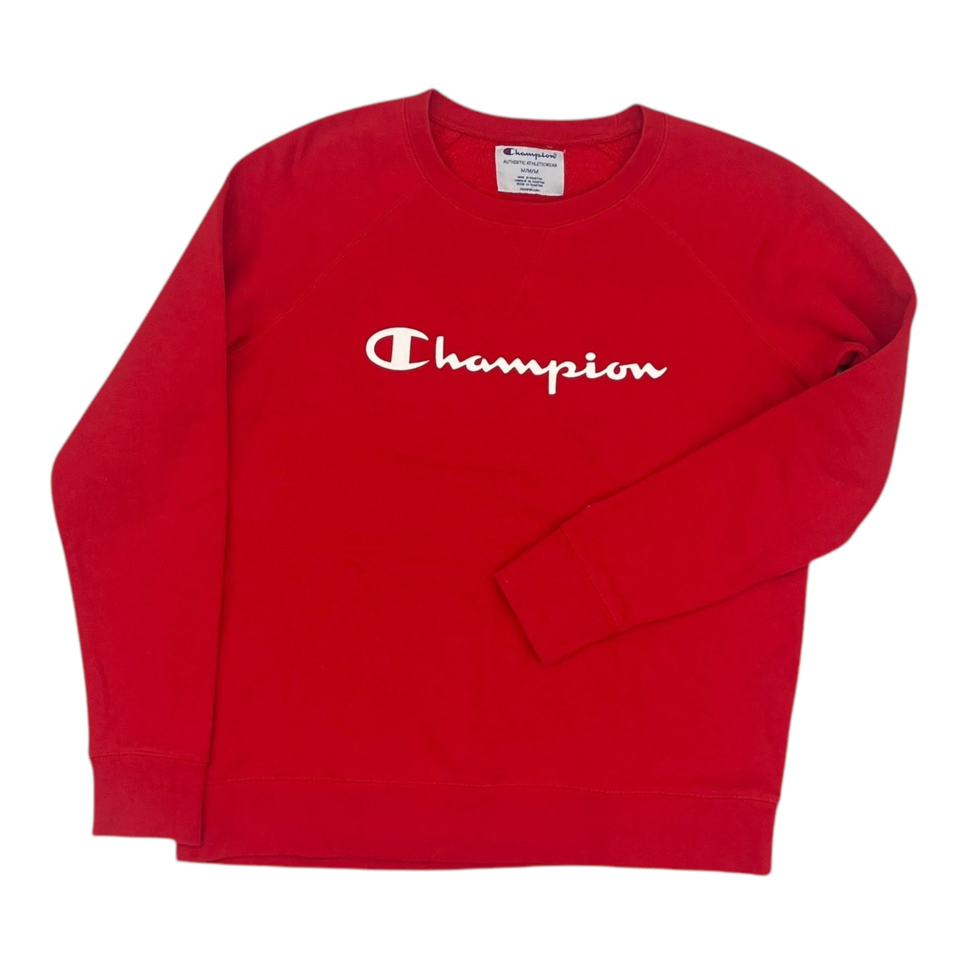 Champion Red Crewneck Sweatshirt in Size M. Cozy, versatile, and classic. Perfect for everyday wear with a touch of sporty flair.